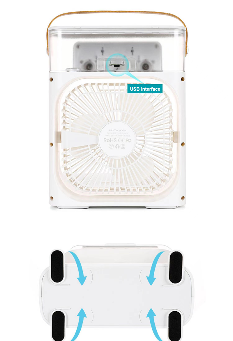 Stay cool, hydrated, and illuminated with our all-in-one Spray Cooling Fan. Defeat the heat with its refreshing mist, enjoy added moisture with the built-in humidifier, and set the mood with vibrant LED lights. Experience ultimate comfort and relaxation in one sleek device.